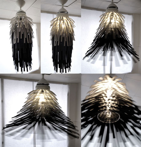 Philippe Malouin has developed a strange looking ceiling fan that is also a light. It looks quite similar to the brushes used for washing cars at automated cleaning stations. The strands transform themselves when in motion beautifully.